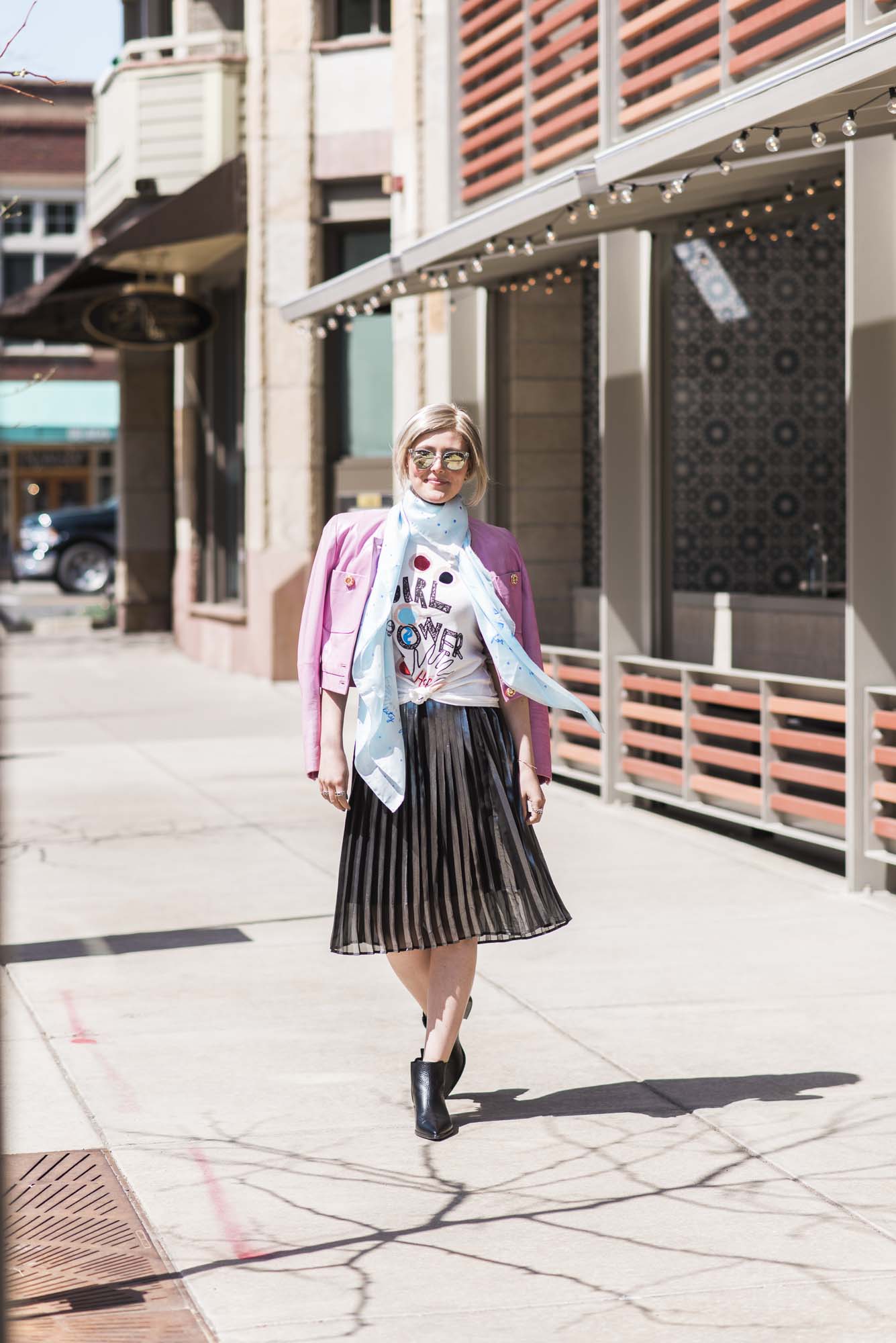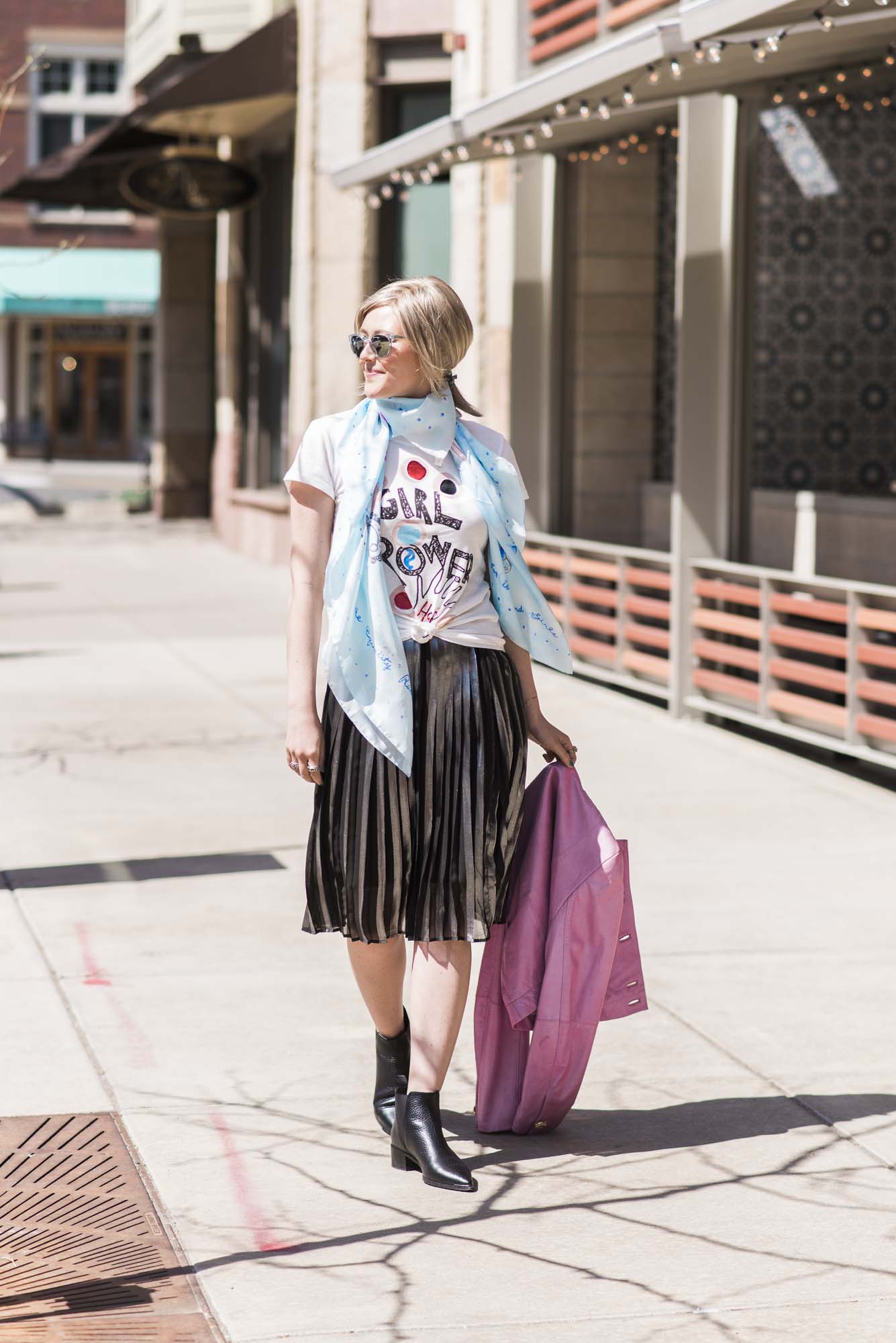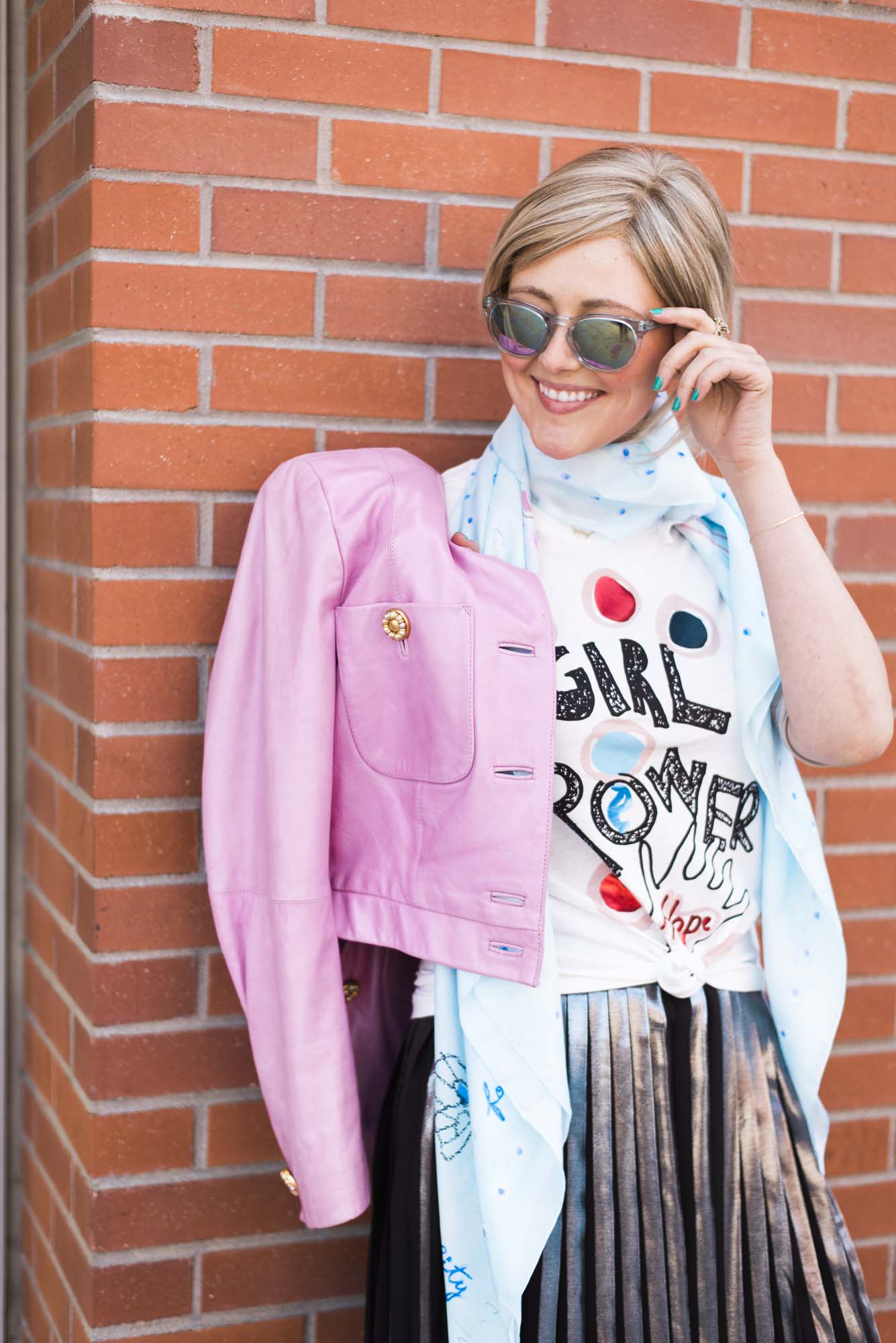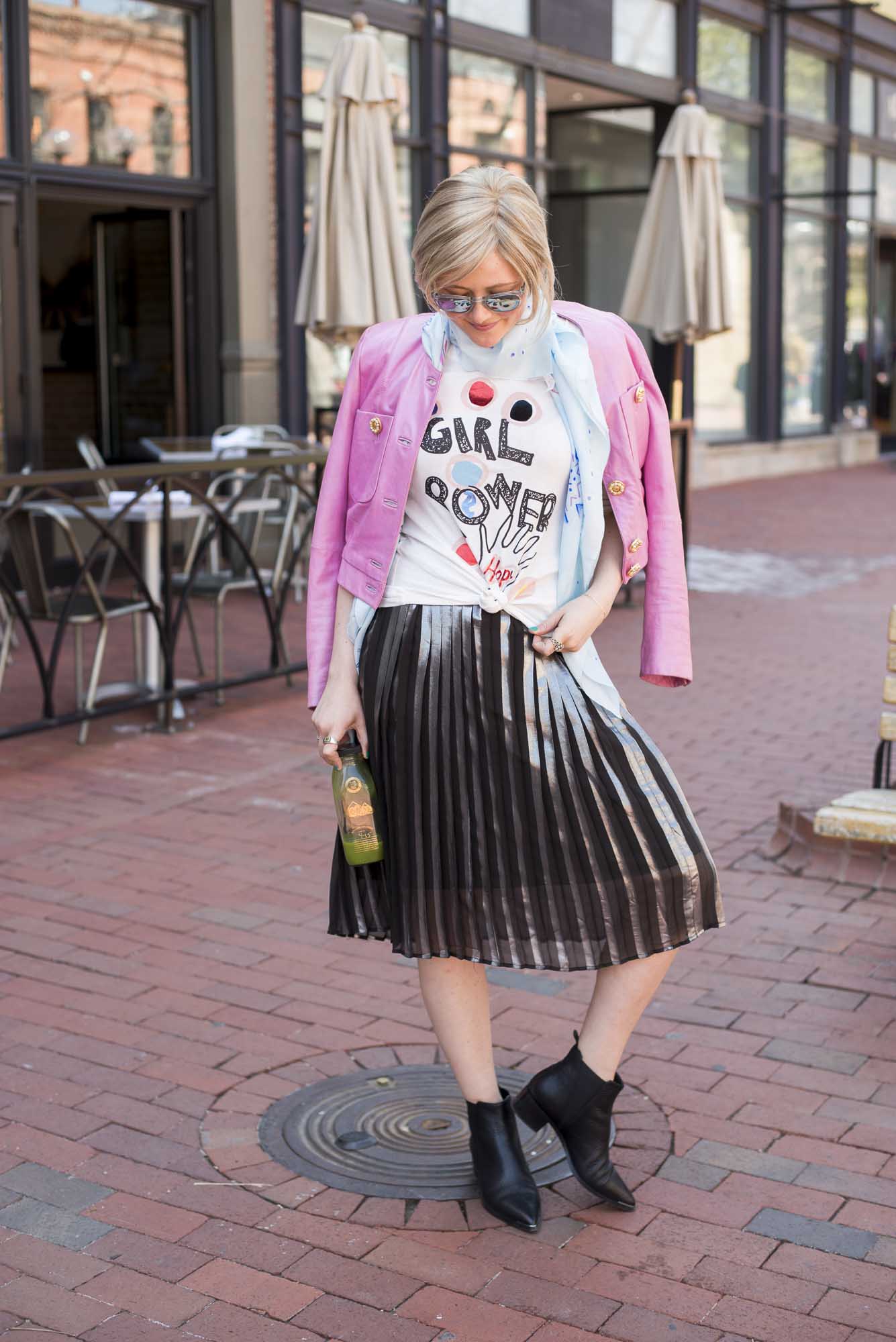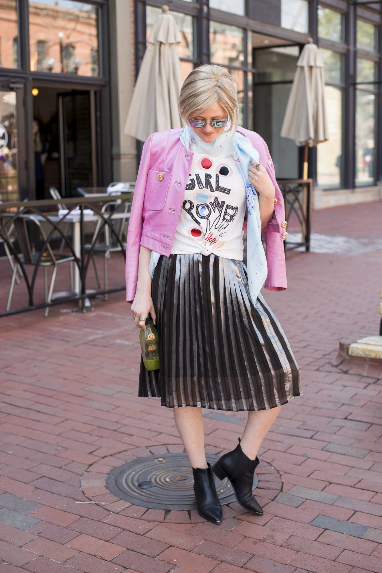 [ROUND + SQUARE Girl Power Tee, $50 / ROUND + SQUARE Aquarelle Paisley Shawl, $165 / Second-hand Whistles Metallic Pleated Skirt (shop similar here) / Acne Chelsea Boots, $560 / Vintage Pink Leather Jacket (shop similar here)]