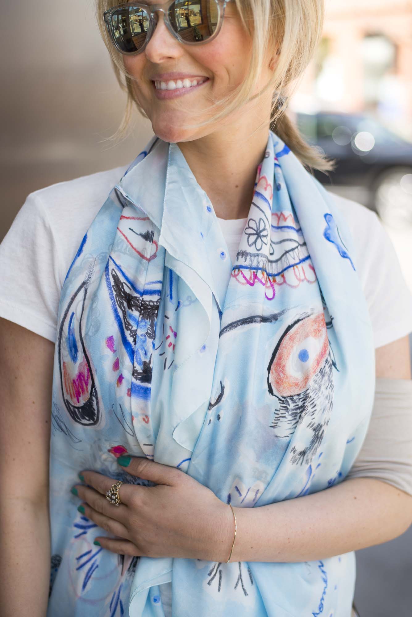 I feel so empowered and beautiful in their iconic “Girl Power” organic t-shirt. The fact that an individual can spread the message of strength, hope and optimism through a t-shirts branding and production shows that ROUND + SQUARE, and fashion in general, is a powerful catalyst for change. The unique design was hand-drawn by Founder, Henriette Ernst and adds a colorful touch to any look. Similarly, the graffiti-inspired Aquarelle Paisley Shawl is a bright accessory for all women at any age. The luxurious, lightweight silk is 100% silk made in Italy and the label is woven out of polyester yarn made out of recycled PET bottles. The shawl features hand-drawn designs using crayons, pencils and markers that make up a raw yet beautiful pattern. Definitely not your average art-project.