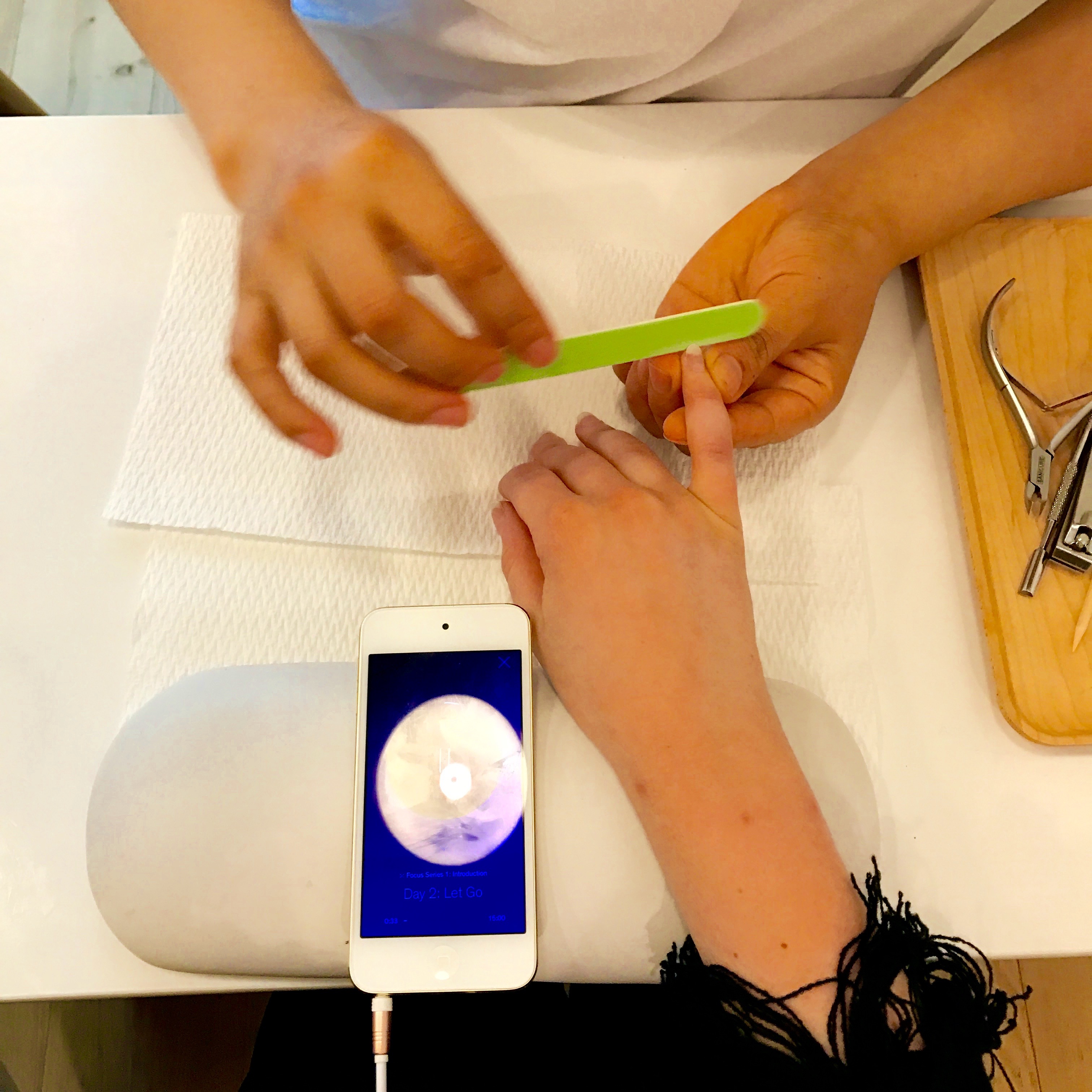 My jacket was swiftly grabbed and placed in coat check as I was guided to a corner seat at a long communal table of nail estheticians painting away like Picasso. A pair of oversized rose gold headphones and an iPhone were placed beside me. The esthetician brought over a new package of utensils (SO important for sanitation reasons. I legit won’t go anywhere that doesn’t do this now) and a bowl of soapy water. I was anxious to put on the headphones to get started, but was stopped and reassured that I would begin after the technician filed my nails. The time came and I slipped into a blissful, cognitive state, completely relaxed as my hands were pampered and a refreshing lavender spritz enveloped my body.