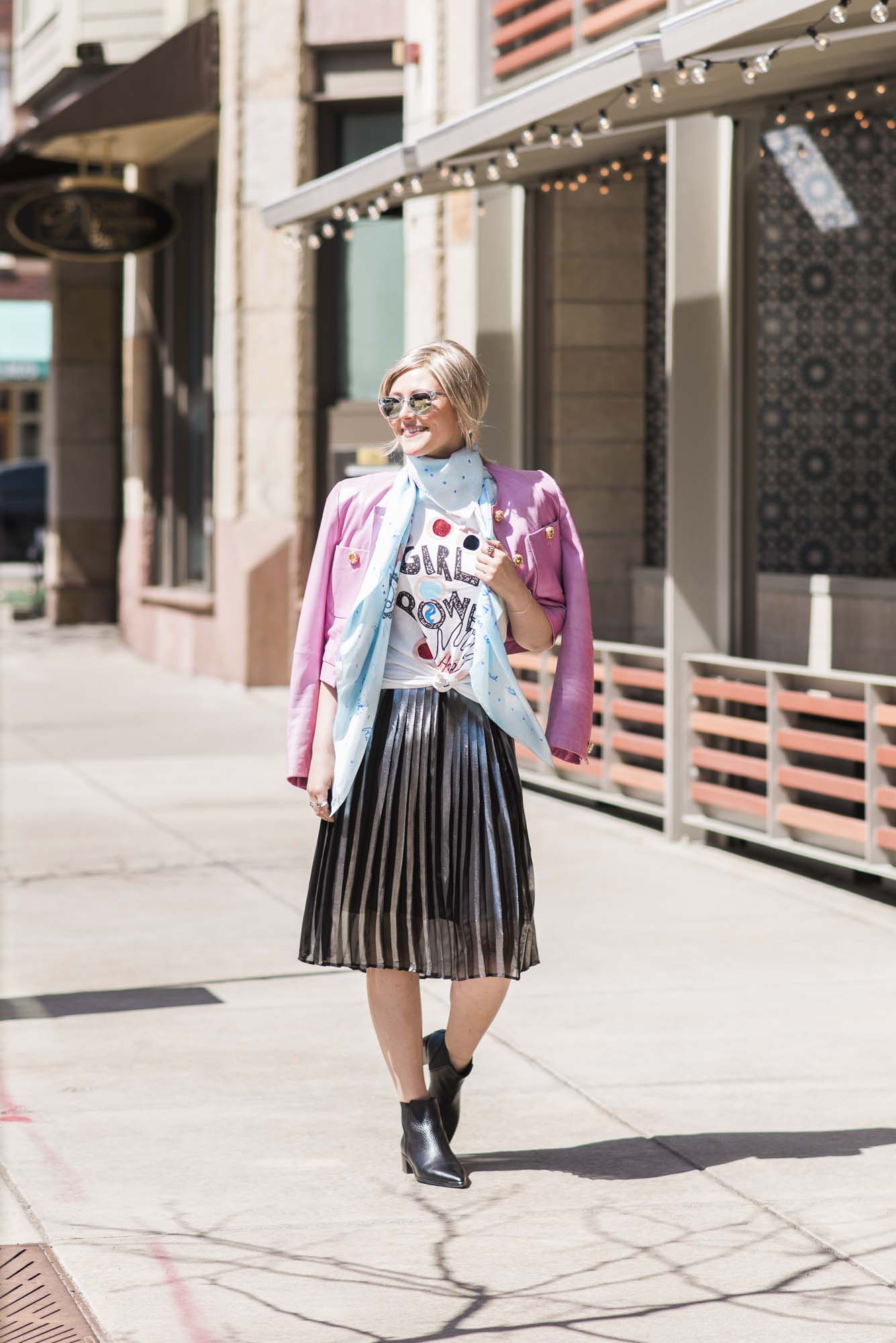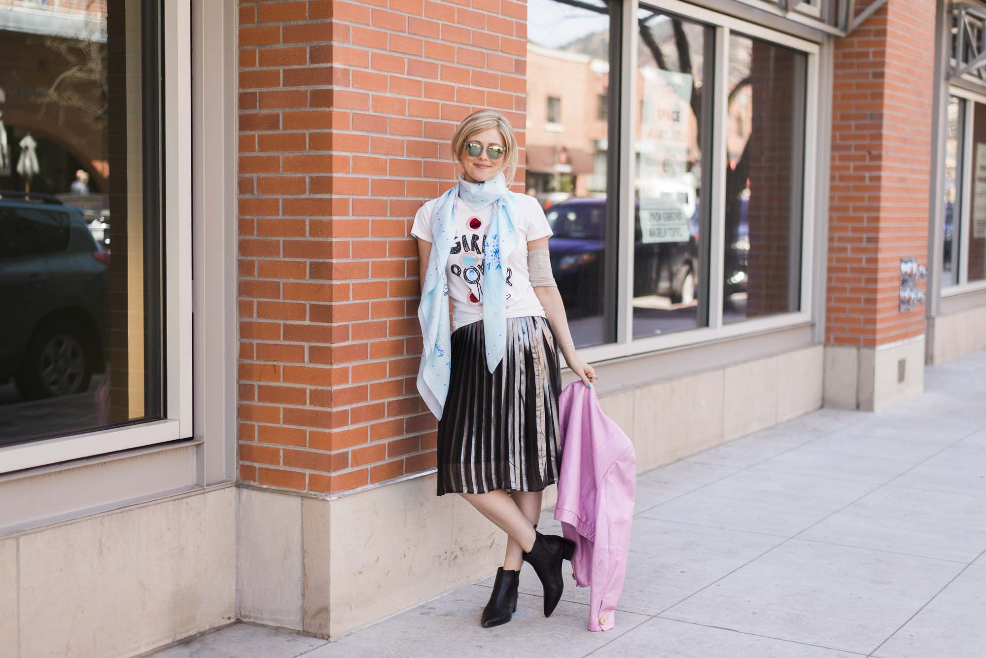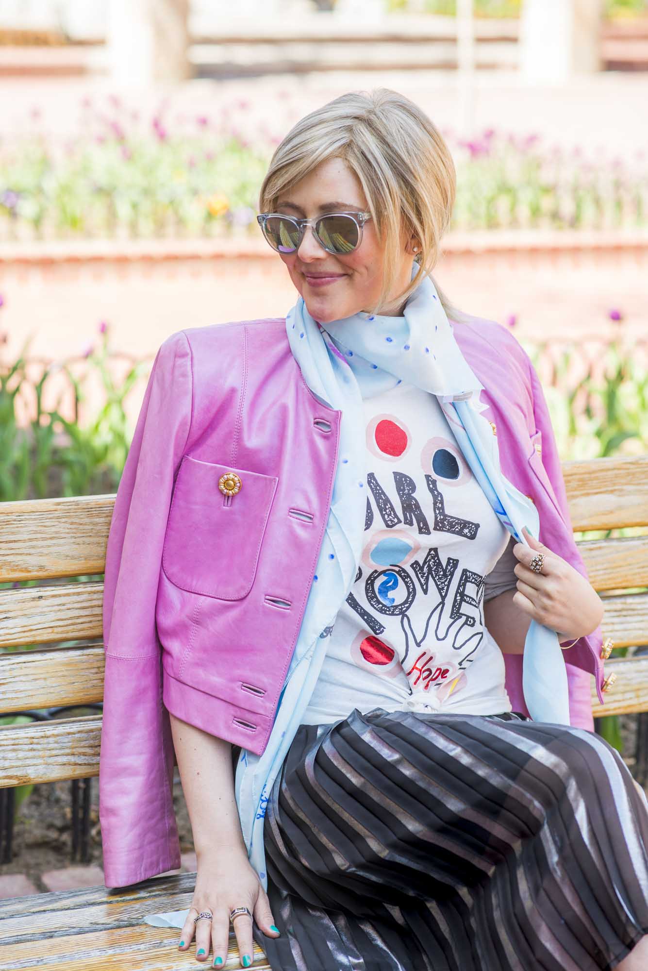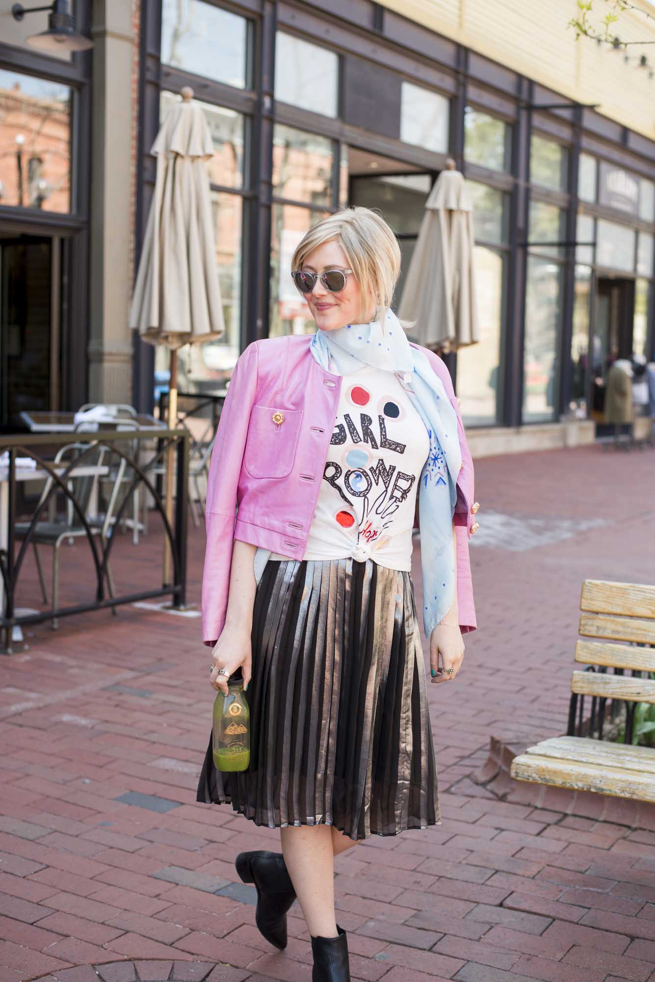 [ROUND + SQUARE Girl Power Tee, $50 / ROUND + SQUARE Aquarelle Paisley Shawl, $165 / Second-hand Whistles Metallic Pleated Skirt (shop similar here) / Acne Chelsea Boots, $560 / Vintage Pink Leather Jacket (shop similar here)]