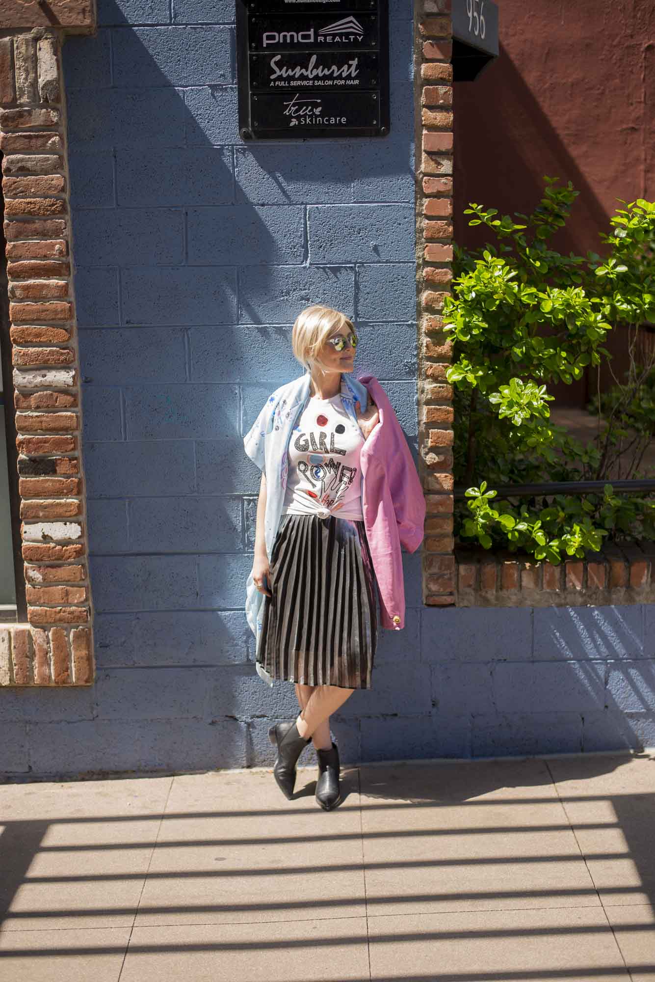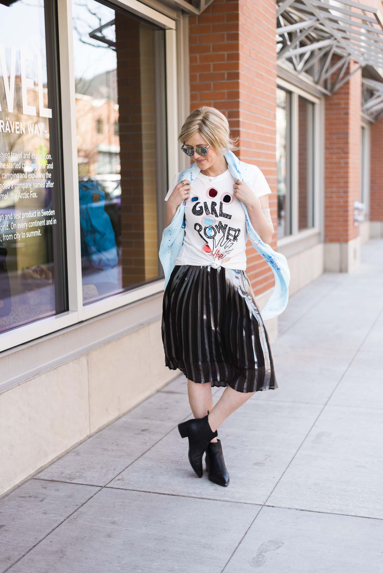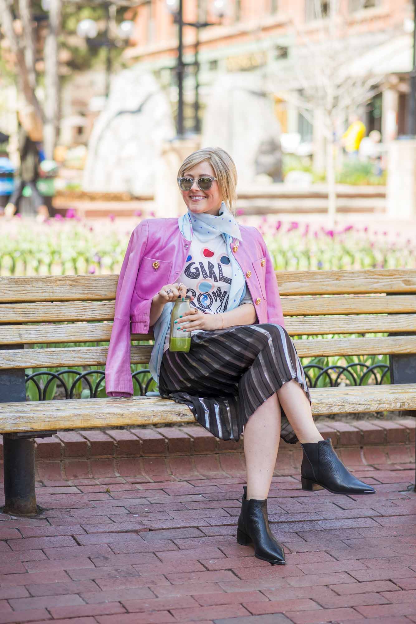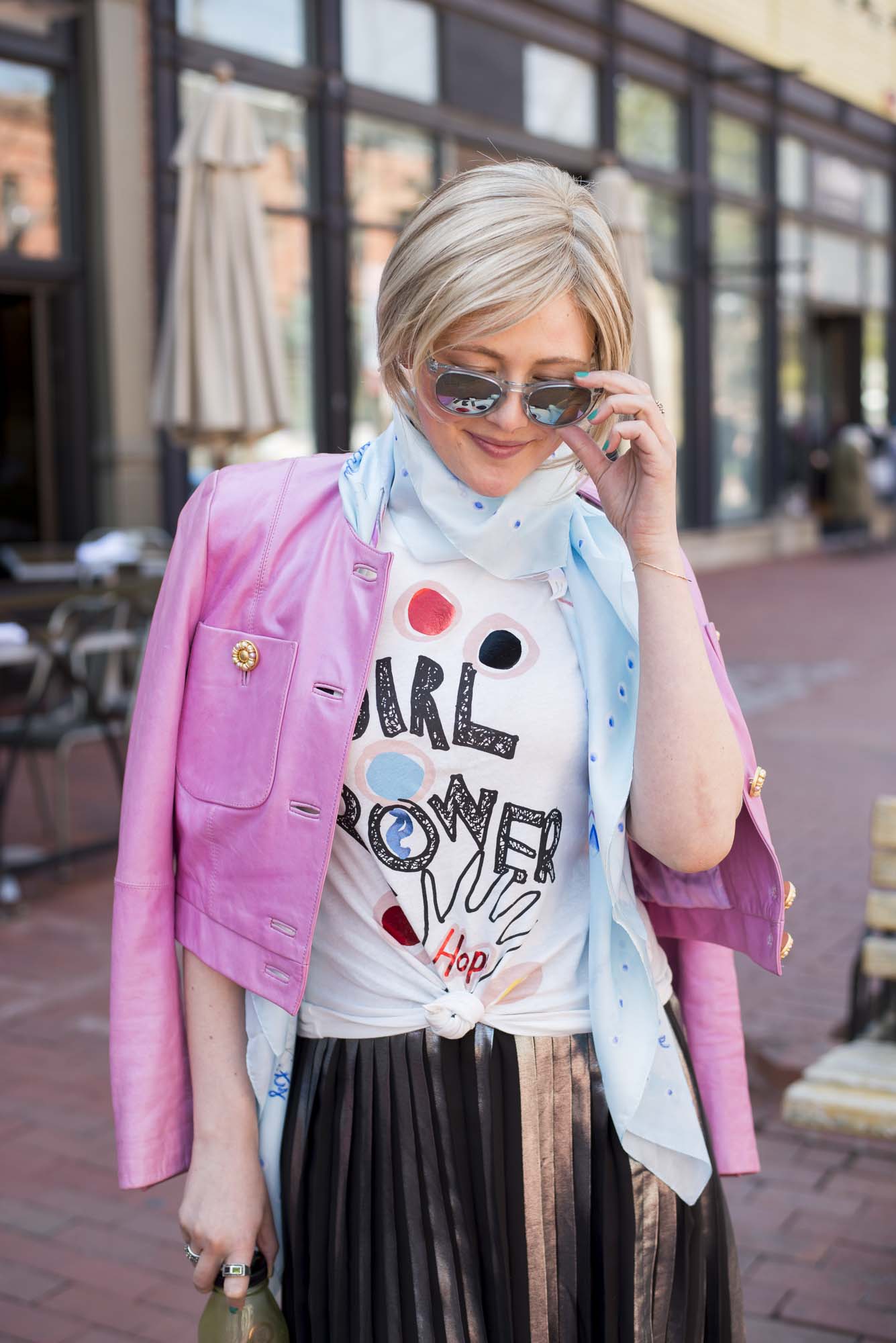 [ROUND + SQUARE Girl Power Tee, $50 / ROUND + SQUARE Aquarelle Paisley Shawl, $165 / Second-hand Whistles Metallic Pleated Skirt (shop similar here) / Acne Chelsea Boots, $560 / Vintage Pink Leather Jacket (shop similar here)]