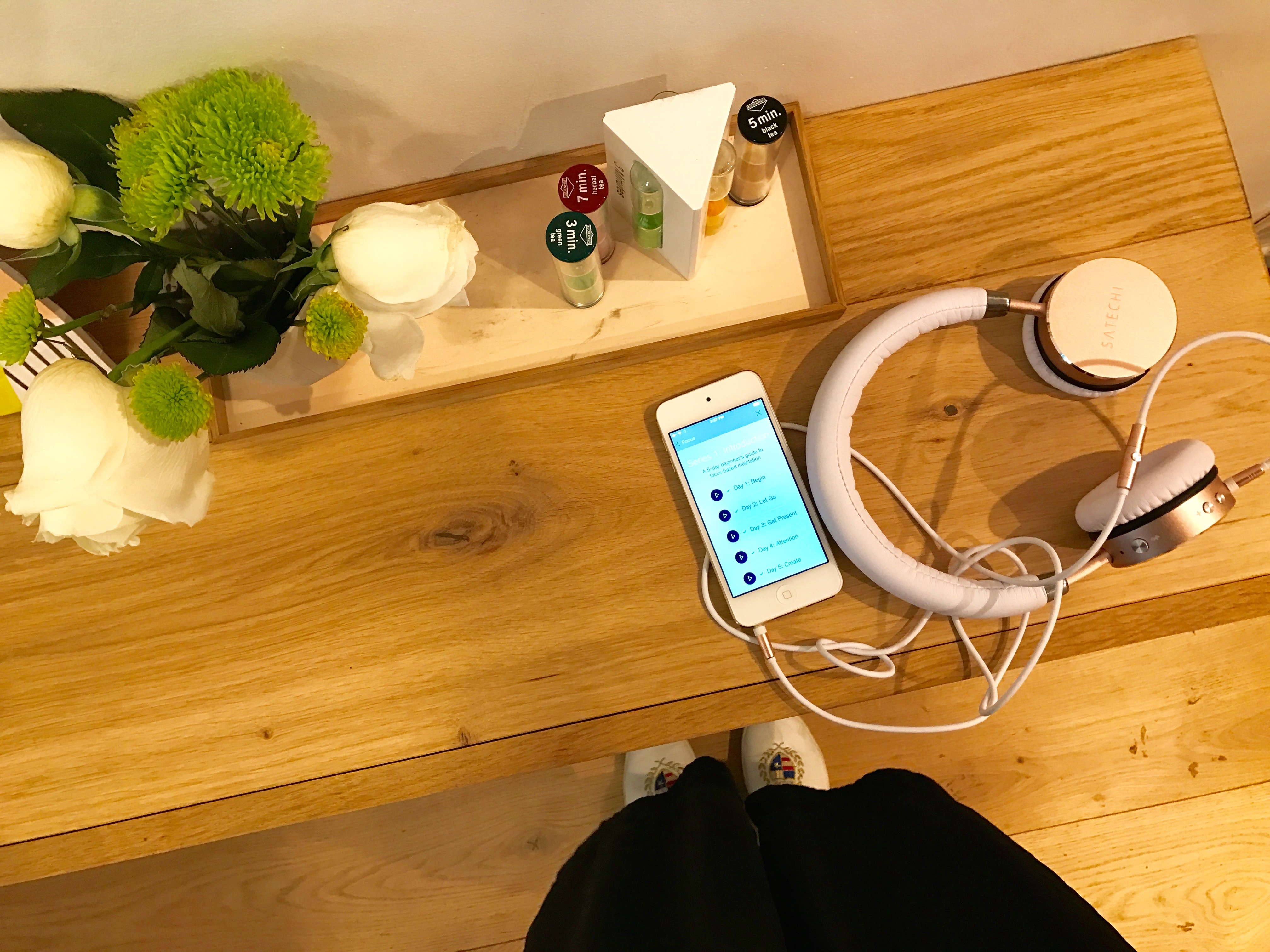 My jacket was swiftly grabbed and placed in coat check as I was guided to a corner seat at a long communal table of nail estheticians painting away like Picasso. A pair of oversized rose gold headphones and an iPhone were placed beside me. The esthetician brought over a new package of utensils (SO important for sanitation reasons. I legit won’t go anywhere that doesn’t do this now) and a bowl of soapy water. I was anxious to put on the headphones to get started, but was stopped and reassured that I would begin after the technician filed my nails. The time came and I slipped into a blissful, cognitive state, completely relaxed as my hands were pampered and a refreshing lavender spritz enveloped my body.